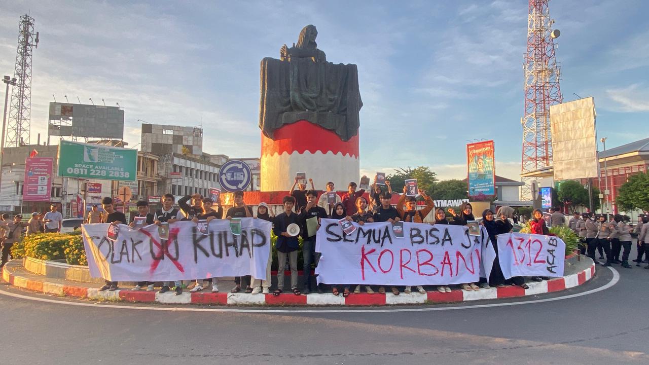 Hari ini, massa yang tergabung dalam aliansi Mahasiswa menggelar aksi simbolik Tolak UU KUHAP di simpang 5 Kota Bengkulu, Sabtu (29/11/2025).